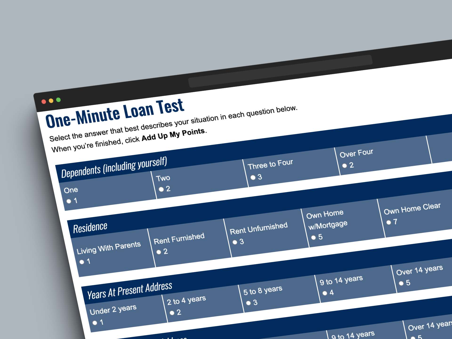 - Take our One-Minute Auto Loan Test. You may be surprised to find out how much more car you can drive.